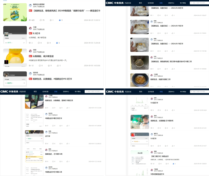 9月2日,2024中集载具减碳行动月——碳足迹打卡活动正式启动。活动以连续3周为活动期限,分别以“健步行”“绿色出行”“光盘行动”为周主题任务。活动期间,员工通过线下完成当周的低碳行为,线上结合共话社区进行碳足迹打卡,完成3项打卡周任务,获得相应的碳积分。载具各成员企业积极参与,共有247人次参加了打卡活动,记录低碳行为。