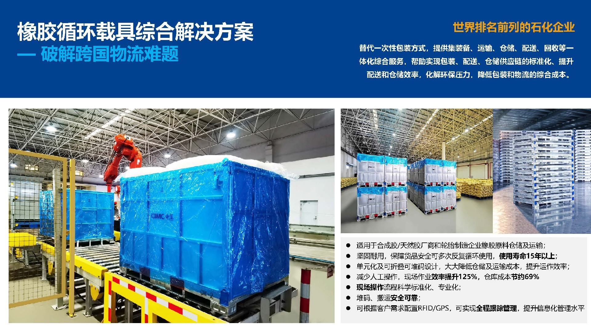 橡胶箱循环载具:解决天然/合成橡胶跨境运输中“一次性包装高成本、易污染、运输风险大”等痛点,产品寿命达 15 年以上,助力客户实现仓储成本节约 69%、现场效率提升 125%,并可配置 RFID/GPS 实现全程数字化管理。