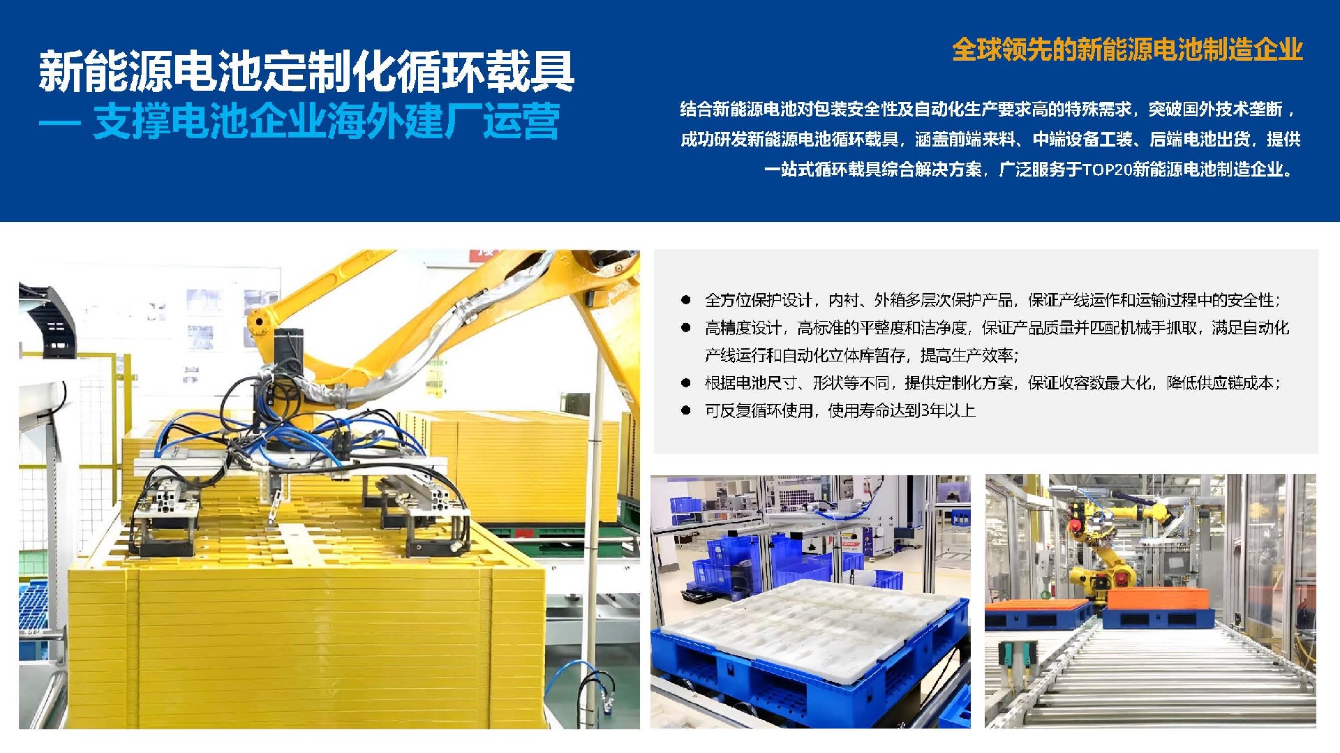 新能源电池定制化循环载具:突破国外技术垄断,为新能源电池产业提供涵盖来料、工装、出货的一站式循环载具解决方案,广泛服务于TOP20 电池企业。