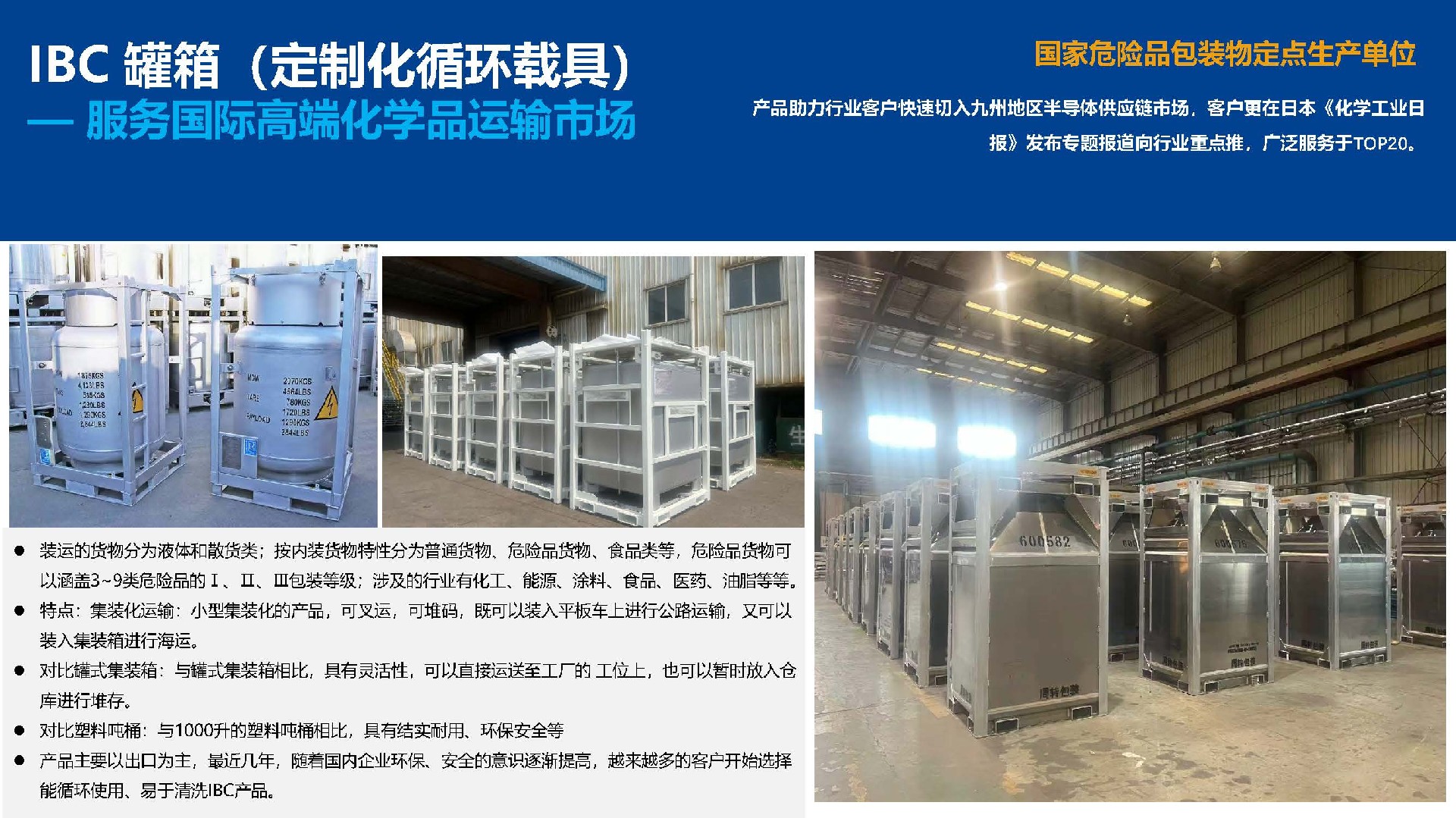 高纯度 IBC 罐箱:满足国际高端化学品运输需求,采用氟树脂涂层工艺大幅降低残留,获 UN 认证,已助力客户进入半导体供应链,并拓展至医药、食品、油脂等多个领域。