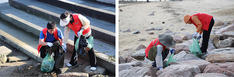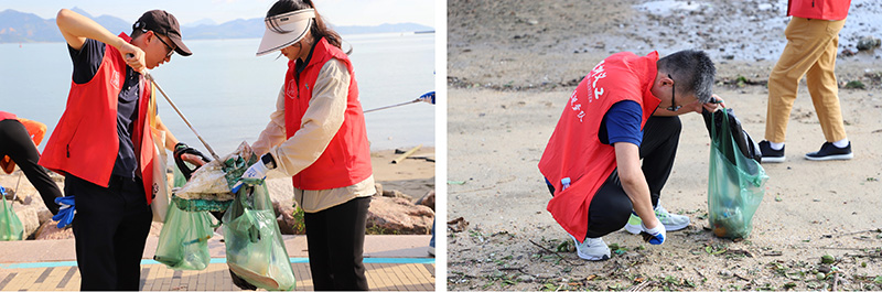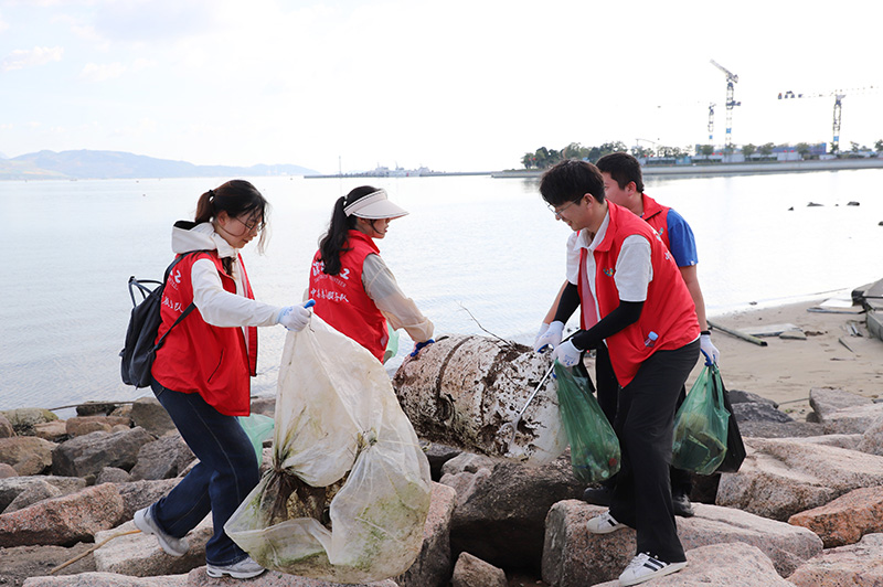 志愿者们认真细致,不放过任何一处藏有垃圾的角落。无论是藏在灌木丛中的废弃纸巾,还是漂浮在岸边的超大泡沫桶,或是卡在礁石缝隙深处的奶茶瓶,大家运用工具和双手,耐心地清洁海岸线上的每寸土地,“一人捡拾、一人收袋”的协作画面随处可见,无声却充满力量。