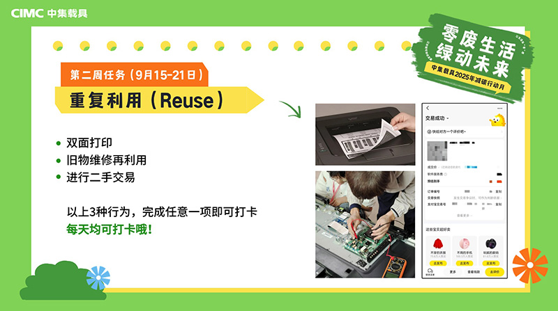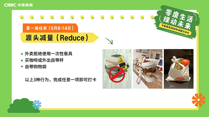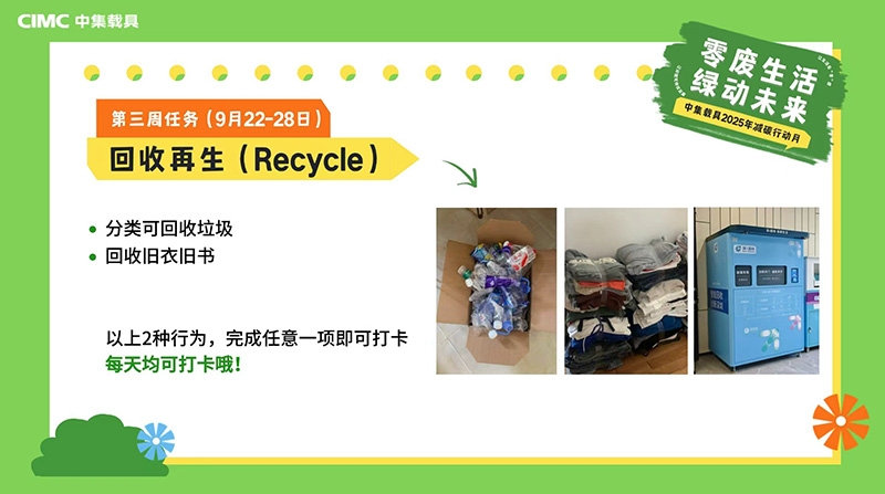 2025年9月,中集载具启动了“零废生活,绿动未来”2025年中集载具减碳行动月第四期活动。作为一项常年持续开展的绿色公益品牌活动,“减碳行动月”自2022年9月启动以来,已连续四年举办不同主题的减碳活动,旨在提升员工低碳环保、节能减排意识及行为,诠释和传递载具倡导绿色低碳的品牌理念。