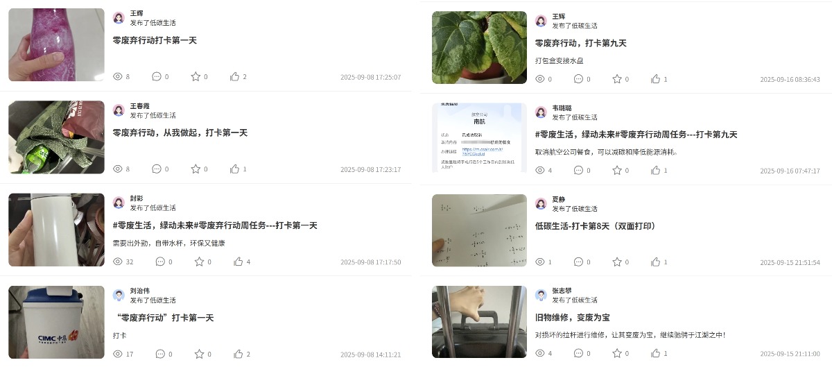员工每日完成任意任务并上传凭证即可打卡,低门槛、高灵活性的设计极大提升了员工参与积极性。最终,本次周任务打卡活动累计吸引150人次积极参与,其中更有伙伴在活动期间连续22天打卡不断,“零废习惯”也借着每日打卡的积累,悄悄融入工作与生活的细节里。