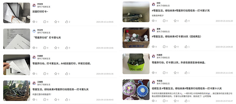 打卡活动聚焦“源头减量、重复利用、回收再生”三大零废核心主题,每周设定不同主题的任务挑战,层层递进引导“零废生活”的绿色行为养成。